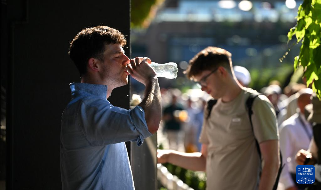 6月30日,在英国伦敦温布尔登网球公开赛赛场,一名男子在饮水机前饮水。