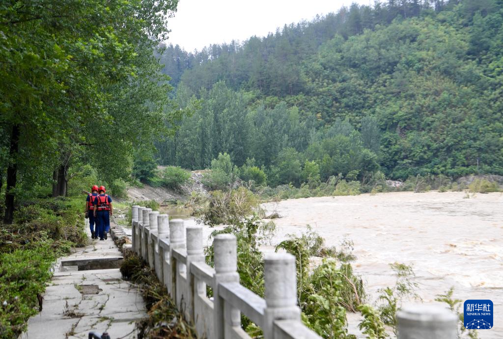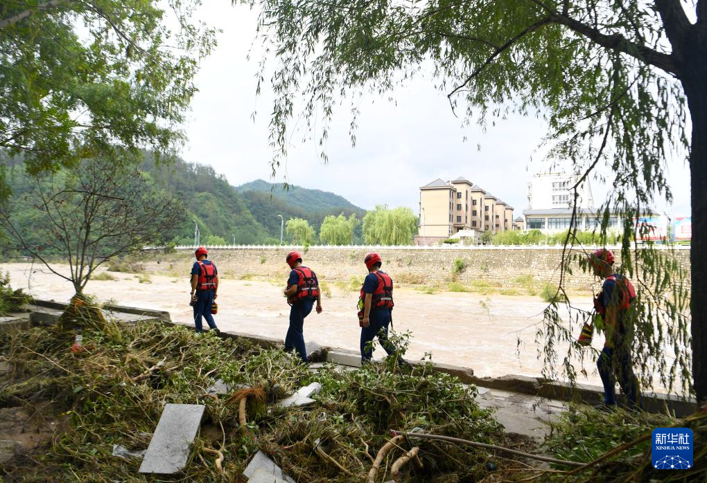 7月2日,河南南阳消防救援支队队员在二郎坪镇附近沿河搜寻失联人员。
