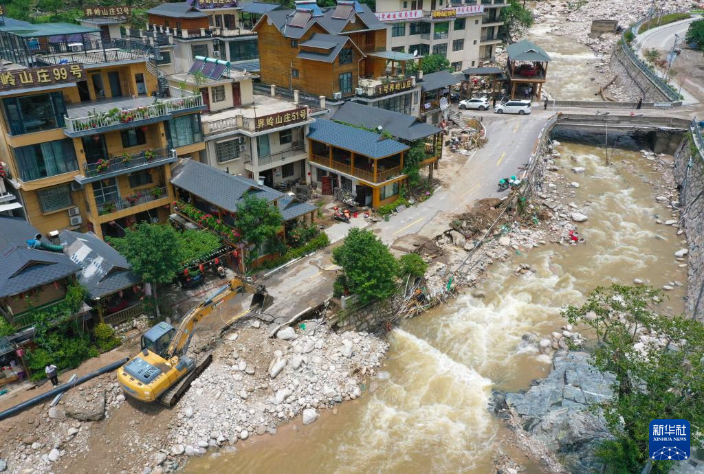 7月2日,挖掘机在西峡县太平镇清理道路碎石(无人机照片)。