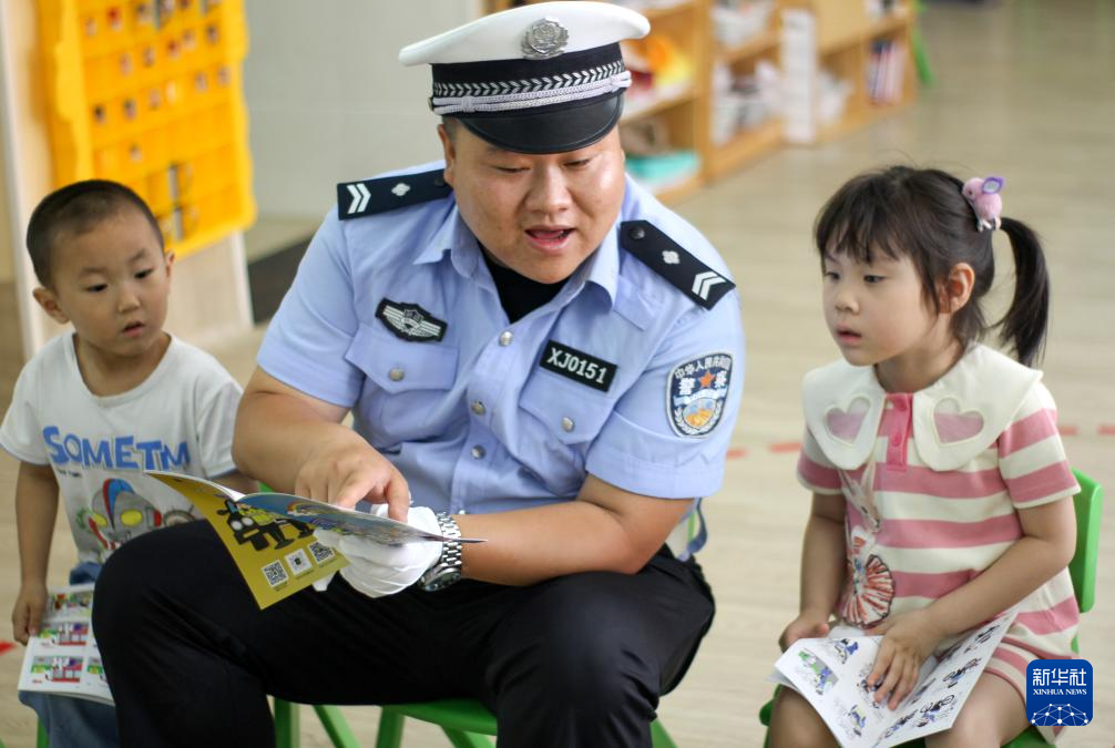 7月3日,乌鲁木齐市公安局交警支队天山区大队解放路中队辅警苏祥在辖区一所幼儿园,为师生们进行暑期交通安全宣传活动。