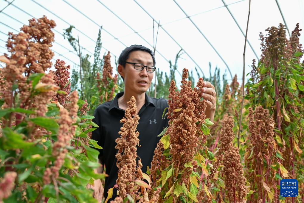 在山西省忻州市静乐县的中国藜麦之乡产业园内,农艺师郝志峰在日光温室育种试验大棚内查看藜麦长势(7月1日摄)。