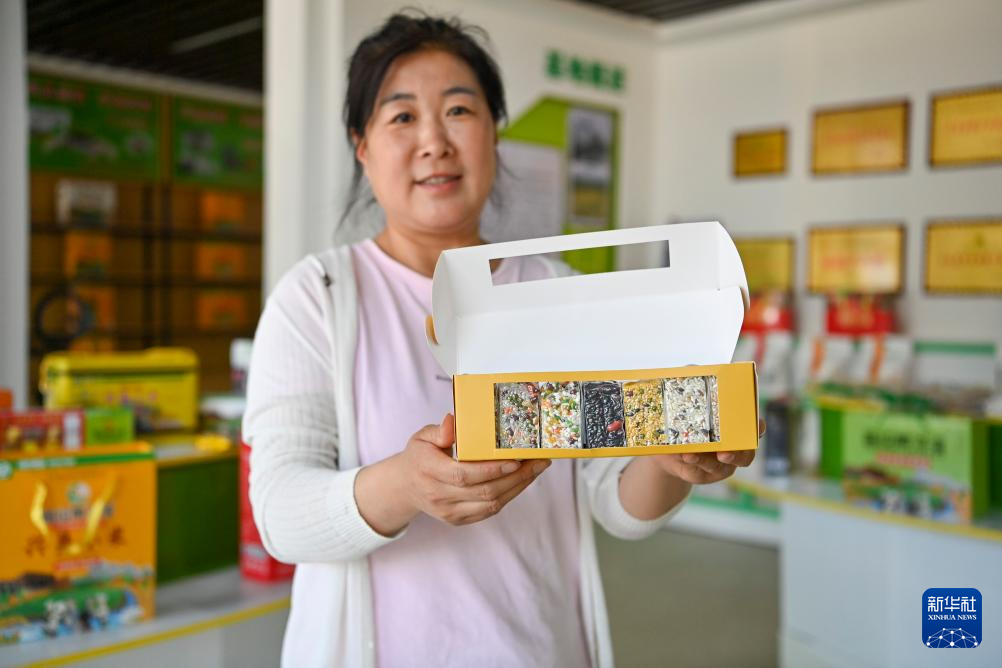 在山西省吕梁市兴县晋绥黄河湾农业开发有限公司,工作人员展示一款杂粮产品(7月1日摄)。