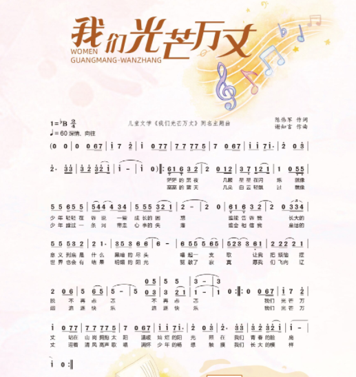 音乐人谢知言为青年作家陈伟军的多部儿童文学作品担纲作曲和制作,在《我们光芒万丈》主题歌里采用了钢琴为主的配器,既保留了童声的纯净感,又增添了音乐的层次感。