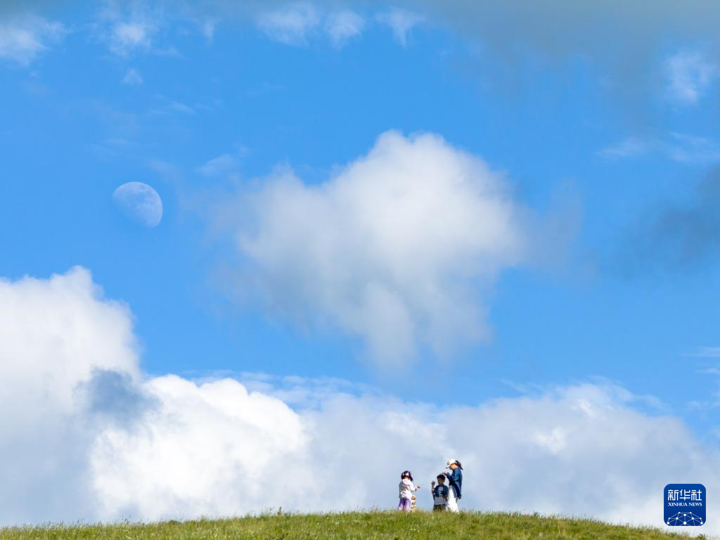 7月5日,游客在敕勒川高山草原游玩(无人机照片)。