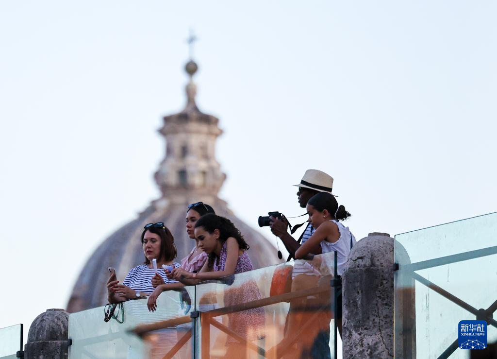 7月5日傍晚,在意大利罗马,游客在古罗马广场留影。