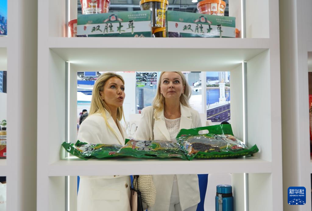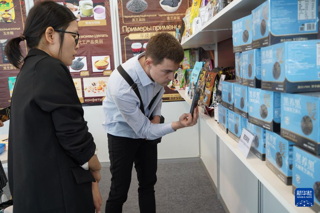 7月7日,在俄罗斯斯维尔德洛夫斯克州首府叶卡捷琳堡国际展览中心,参展者在第九届中俄博览会现场了解中国农副产品。新华社记者 刘恺 摄
