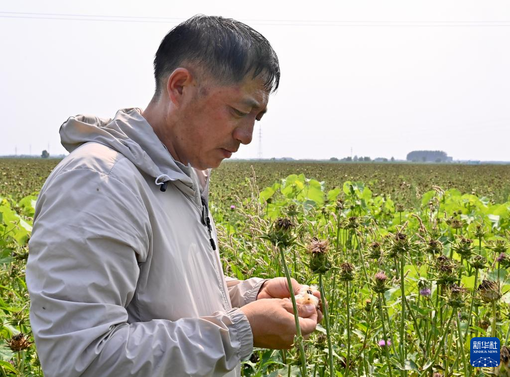 7月8日,一名种植户在查看水飞蓟成熟情况。