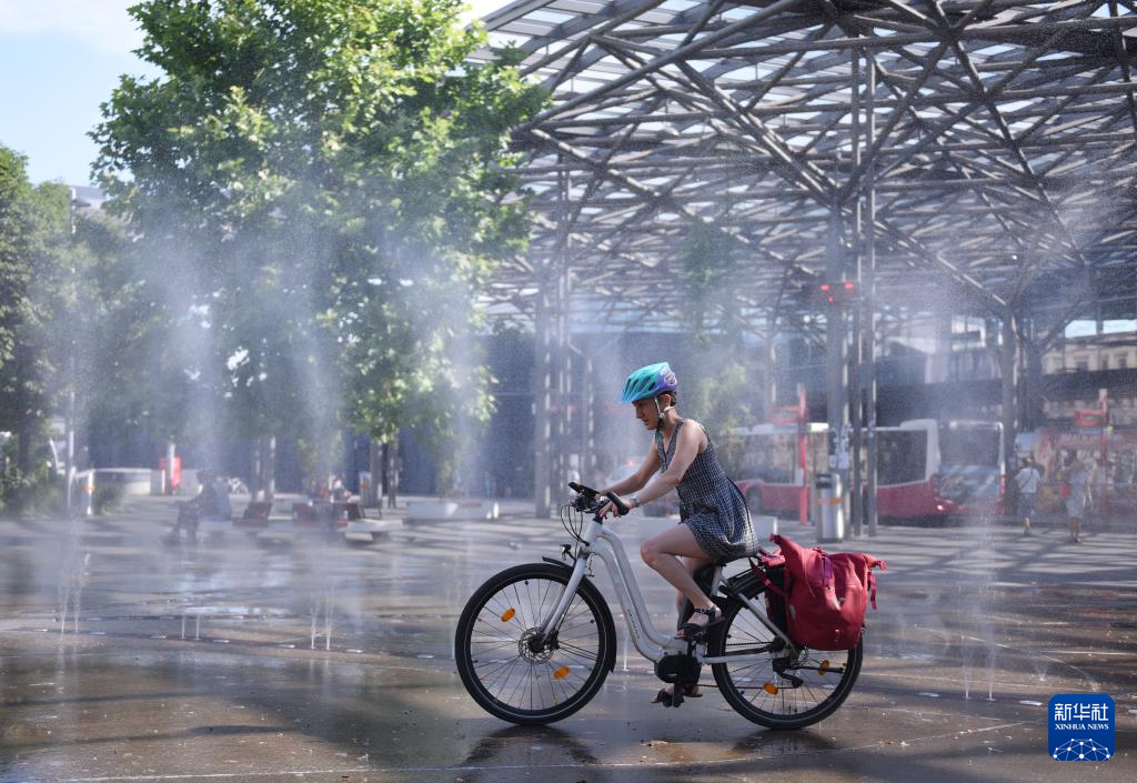 7月3日,在奥地利维也纳,一名女子骑车经过一处喷泉装置。