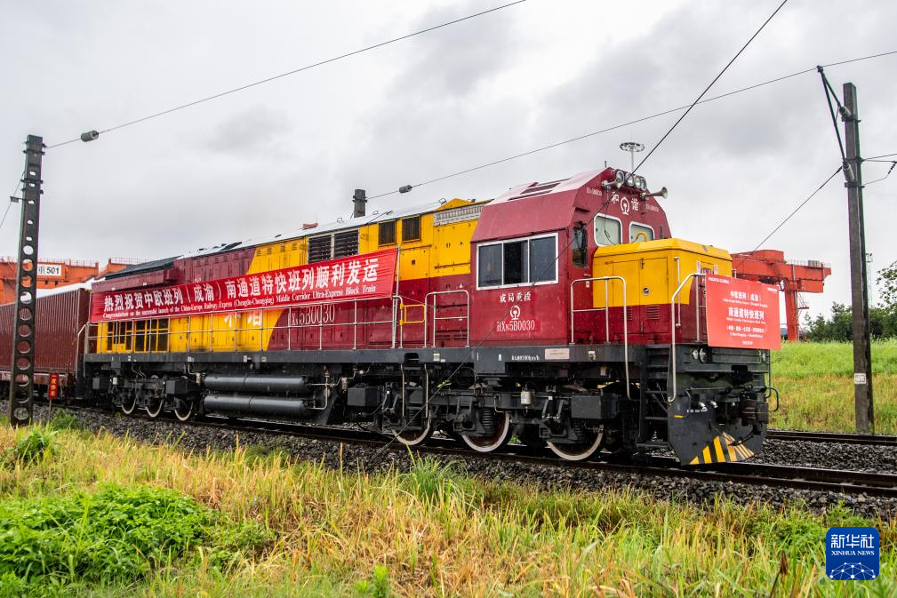 7月9日,中欧班列(成渝)南通道特快班列在重庆团结村中心站顺利发车。新华社记者 唐奕 摄
