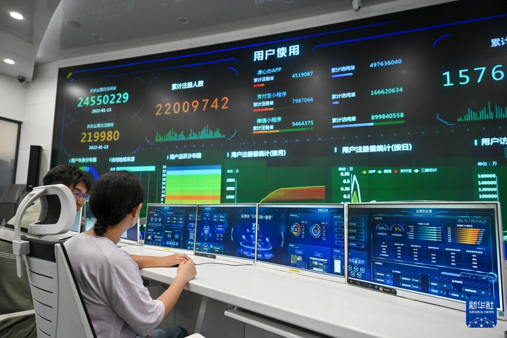 7月9日,在天津市数据发展中心,工作人员展示“津心办”数字社会综合应用平台,目前该系统累计注册用户超过2180万,提供市级服务事项1500余项。