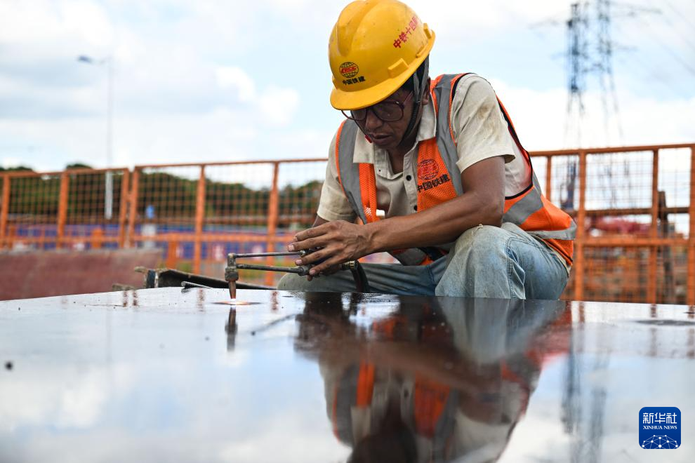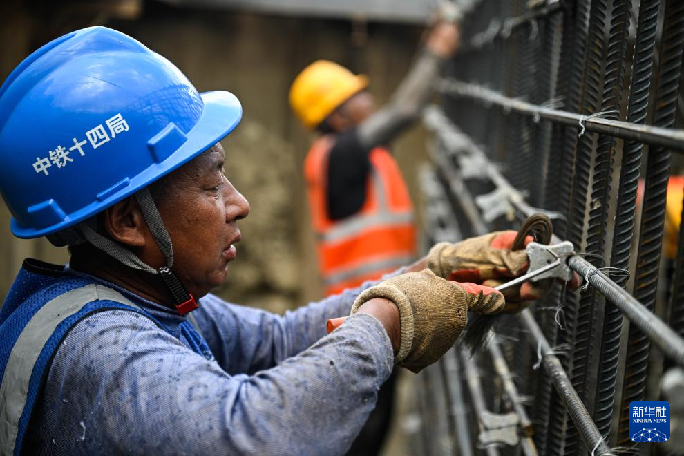 7月9日,中铁十四局工人在进行承台钢筋绑扎。