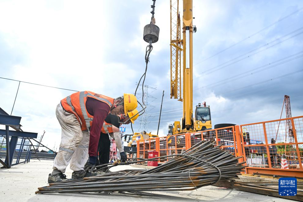 7月9日,中铁十四局工人在吊运预埋钢筋。