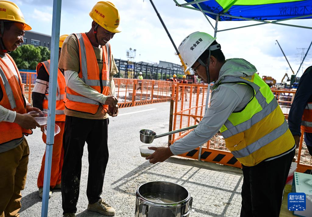 7月9日,中铁十四局工作人员给工人盛绿豆汤。