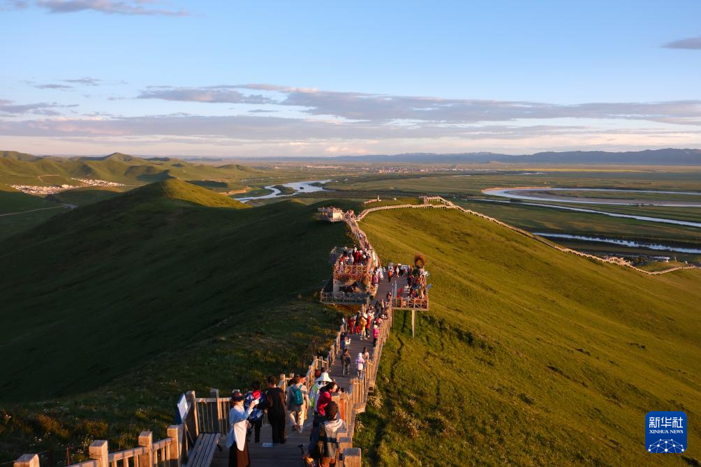 7月12日,游客行走在若尔盖九曲黄河第一湾景区栈道上。