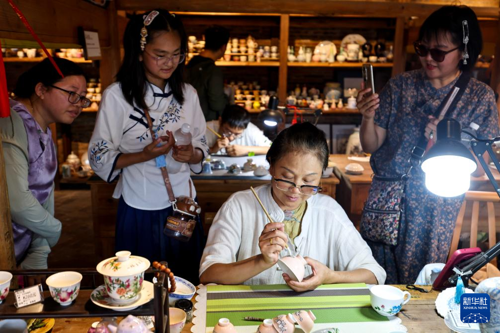 7月13日,游客在江西省景德镇市陶阳里历史文化街区观摩现场创作。