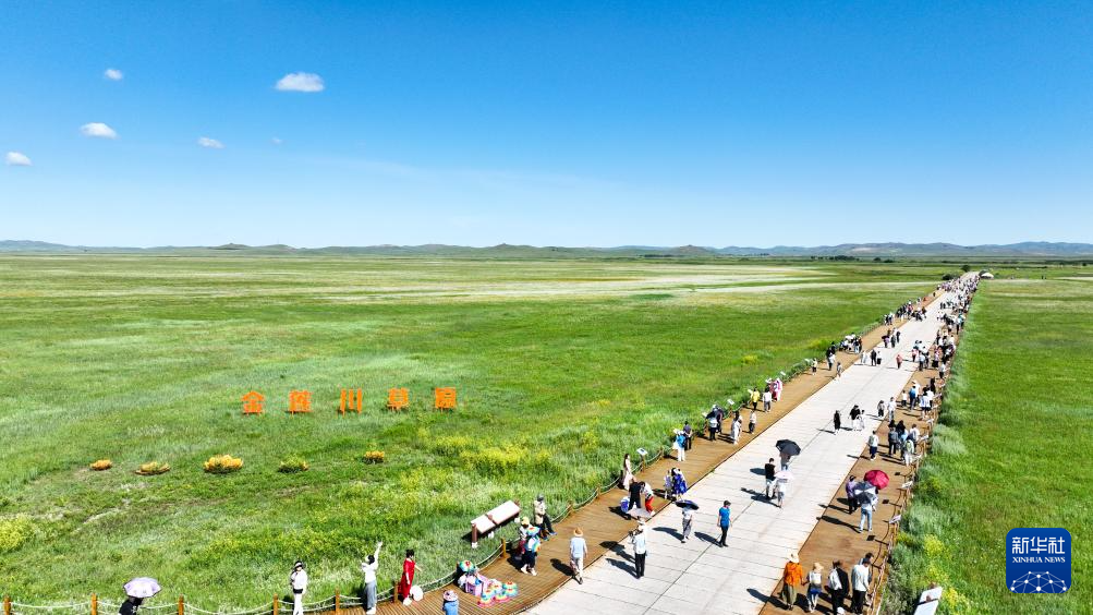 盛夏时节,内蒙古锡林郭勒盟正蓝旗金莲川草原迎来最佳观赏期,金黄色的花海与苍茫草原相映成趣,世界文化遗产元上都遗址的断壁残垣在草原上清晰可见。游人流连花丛中或驻足遗址前,感受自然野趣与历史文化。