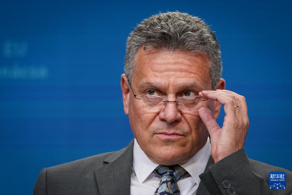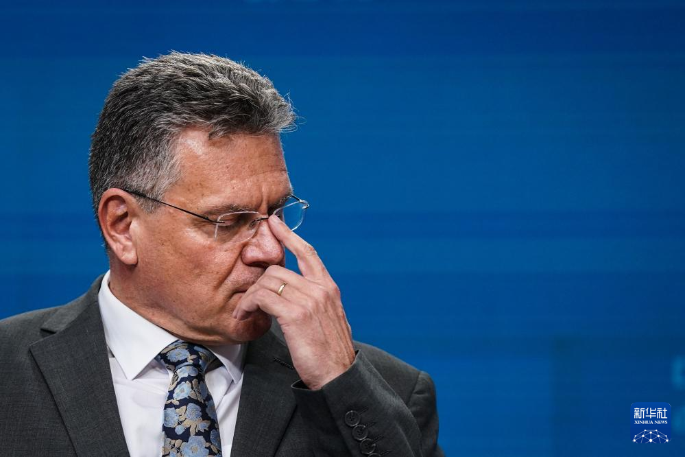 7月14日,在比利时布鲁塞尔,欧盟委员会负责贸易和经济安全等事务的委员谢夫乔维奇出席新闻发布会。