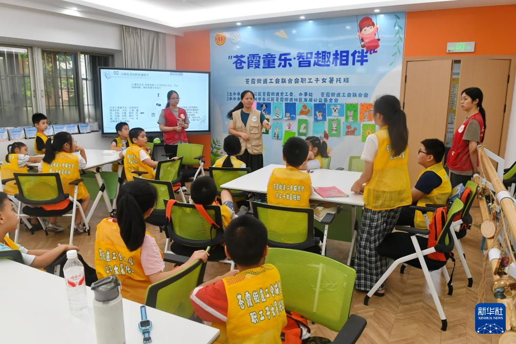 7月14日,在一处位于福州苍霞新城嘉华苑的社工服务中心,老师与职工子女暑托班的孩子们开展教学互动。