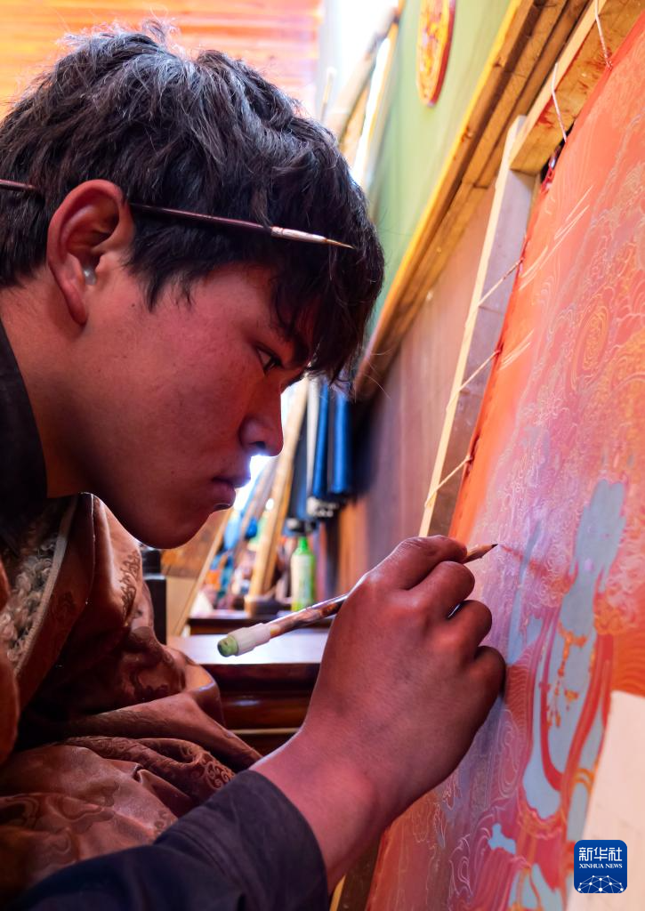 2024年11月22日,昌都市丁青县拥忠文化艺术中心非遗扶贫就业工坊学员在画唐卡。
