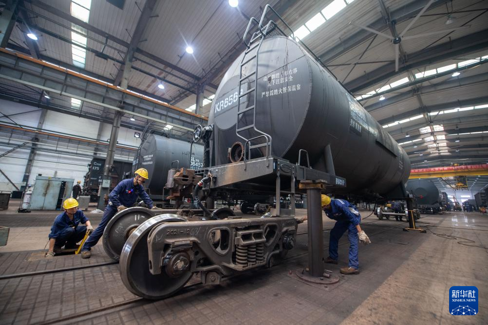 7月15日,铁路职工在中国铁路上海局集团有限公司杭州北车辆段乔司检修车间内工作。