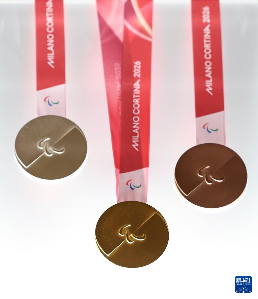这是发布活动现场拍摄的2026年米兰-科尔蒂纳冬残奥会奖牌。