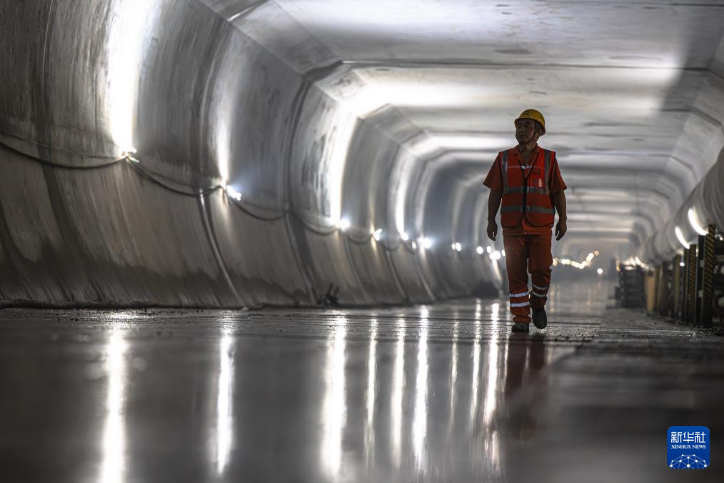 7月16日,中铁十四局工人在贯通的隧道内巡查。