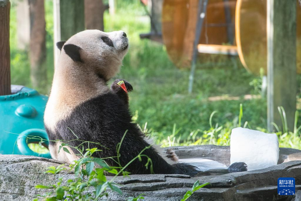 7月16日,大熊猫在重庆动物园吃冰镇水果。