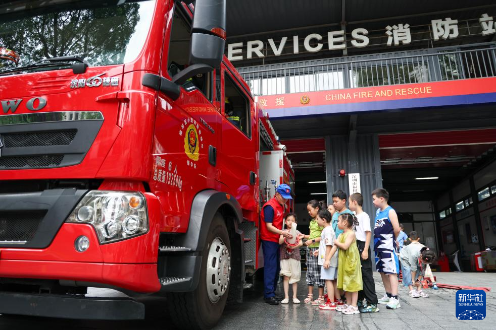 7月15日,站长孙航(左一)在深圳市福田区梅丰小型消防站开放日活动上为小朋友科普消防知识。
