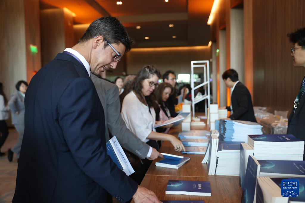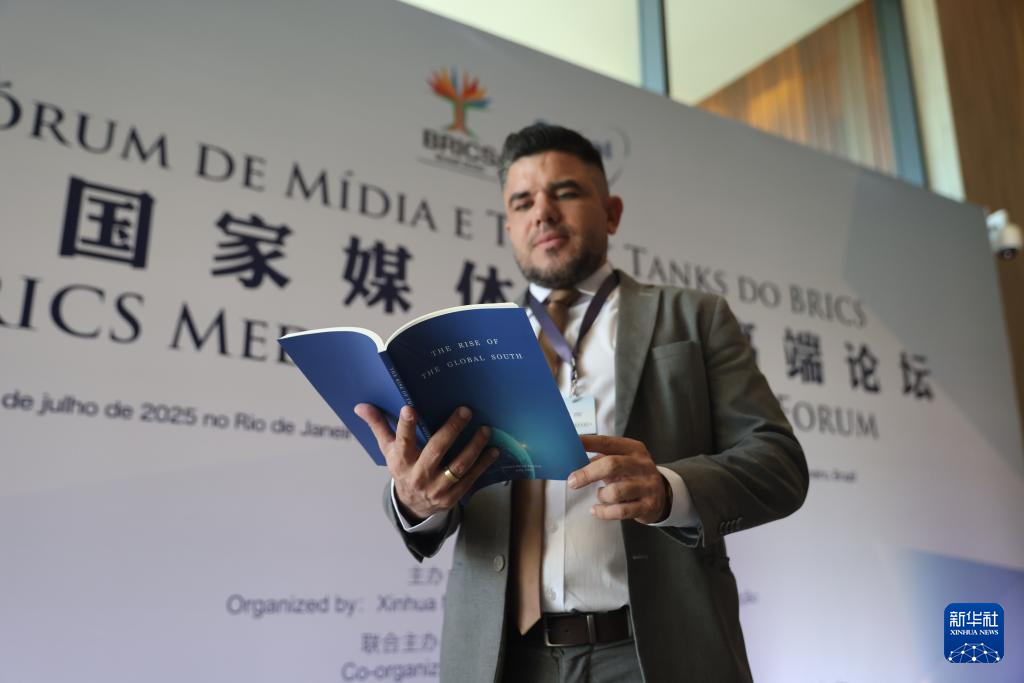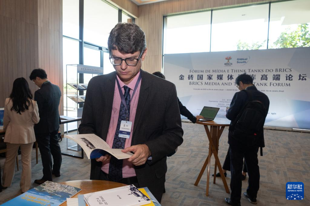 7月16日,在巴西里约热内卢,嘉宾在金砖国家媒体智库高端论坛上翻阅《南方崛起》。新华社记者 李梦馨 摄