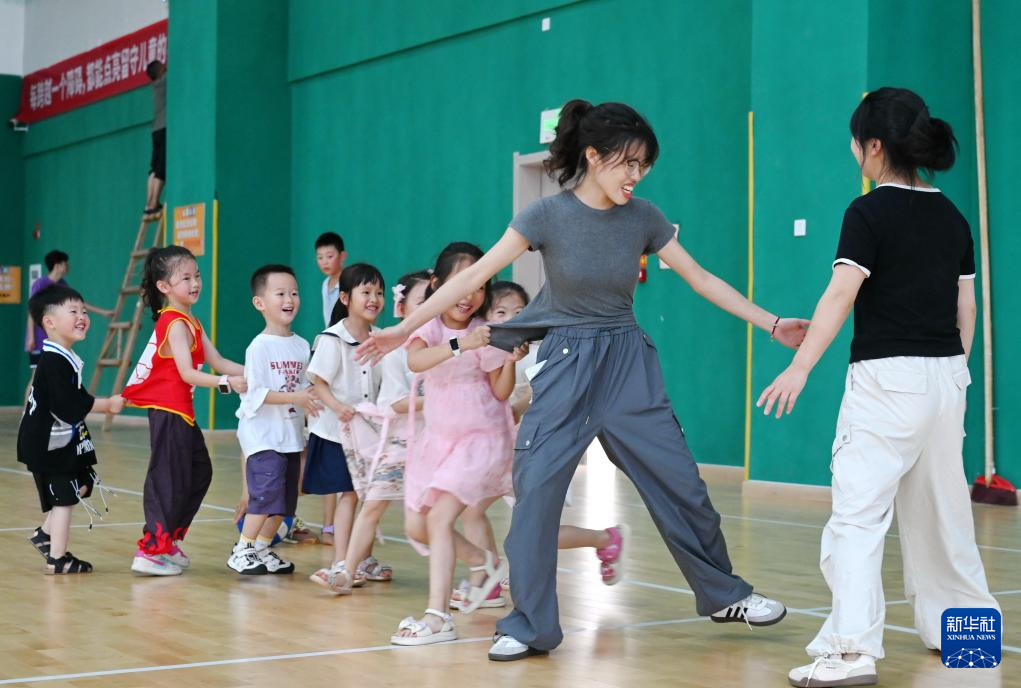 7月16日,教师志愿者苏宝珠(右二)、陆则莲(右一)与孩子们在公益暑托班上开展老鹰抓小鸡游戏。