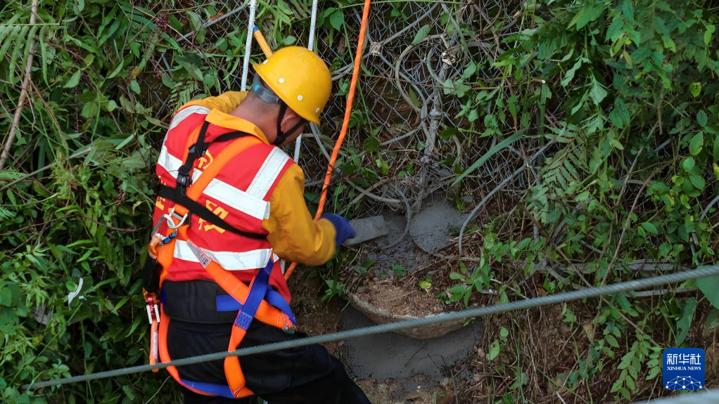 桥隧工人对隧道顶部危石隐患点进行加固(7月15日摄,无人机照片)。