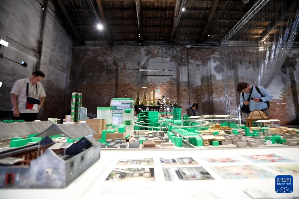7月16日,在意大利威尼斯,参观者在第19届威尼斯国际建筑双年展中国馆观看展品《更新城》。