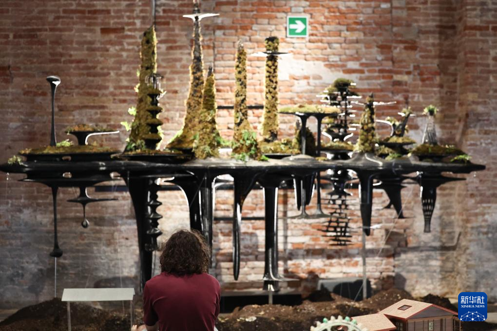 7月16日,在意大利威尼斯,参观者在第19届威尼斯国际建筑双年展中国馆观看展品《天空城》。