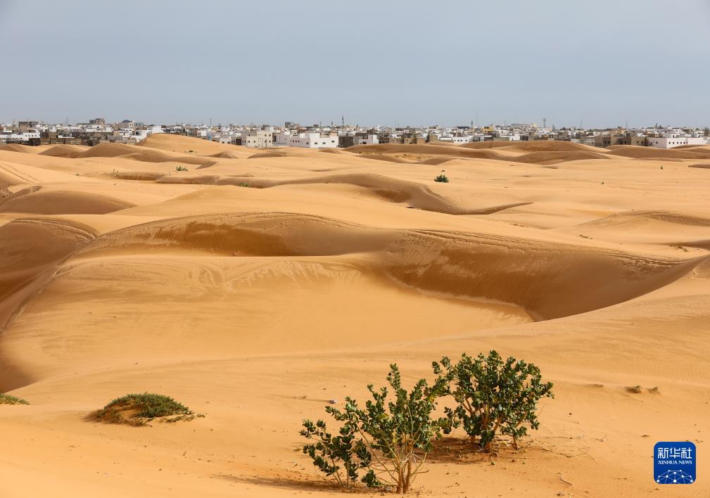 这是7月17日在毛里塔尼亚首都努瓦克肖特拍摄的沙丘和城市景观。