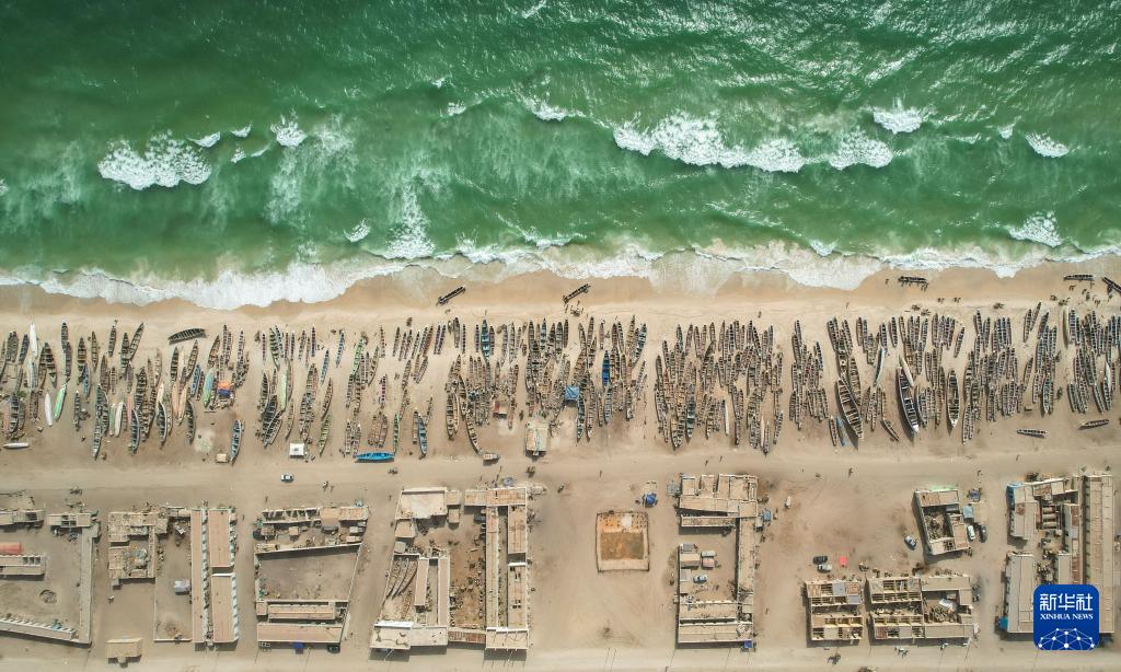 这是6月17日在毛里塔尼亚首都努瓦克肖特拍摄的渔港(无人机照片)。