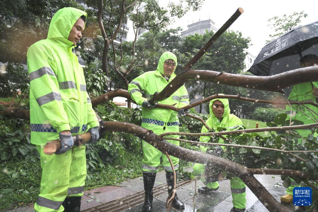 7月20日,工作人员冒雨在深圳红岭北路清理被台风吹倒的树木。