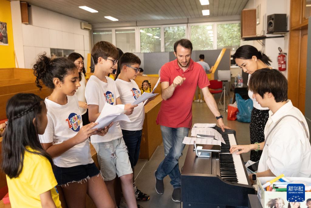 7月18日,在意大利博洛尼亚,绣球花小合唱团与安东尼亚诺小合唱团的团员们一起练习歌曲。