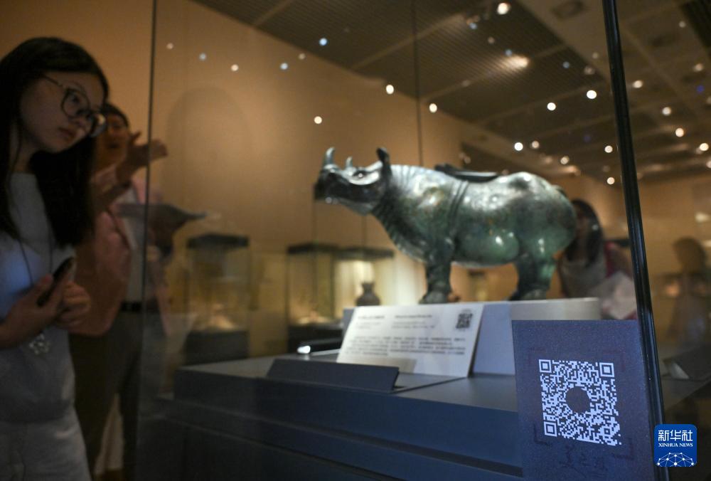 这是7月21日拍摄的错金银云纹青铜犀尊与"美之道"二维码。