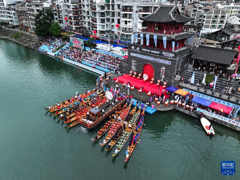 当日,2025年民体杯全国龙舟比赛在贵州省黔东南苗族侗族自治州镇远古城开幕。来自全国各地的10支龙舟队伍同场竞技,在镇远古城的㵲阳河上参加为期两天的水上竞速。赛事期间同时举办非遗展演、"龙神嫁妹"主题巡演等丰富多彩的活动。