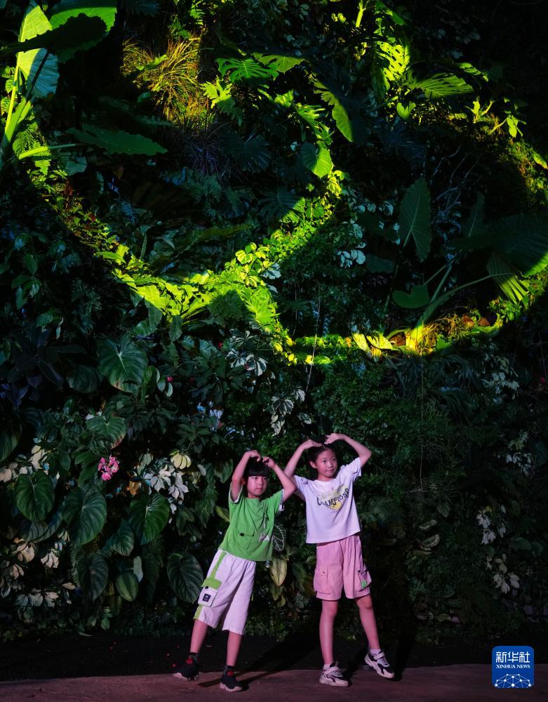7月21日晚,夜游温室花园(测试场)的小朋友在拍照。