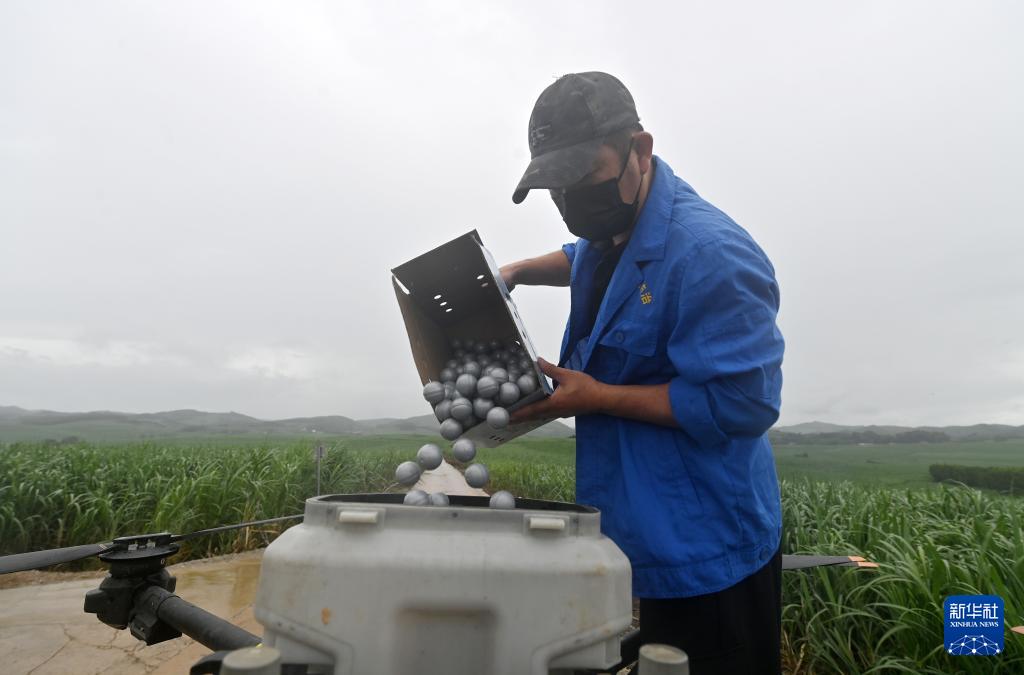 7月23日,在位于广西上思县的昌菱农场蔗区,技术人员在将螟黄赤眼蜂球倒入无人机。