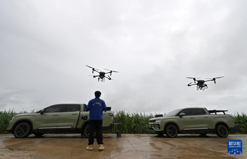7月23日,在位于广西上思县的昌菱农场蔗区,技术人员操控无人机。
