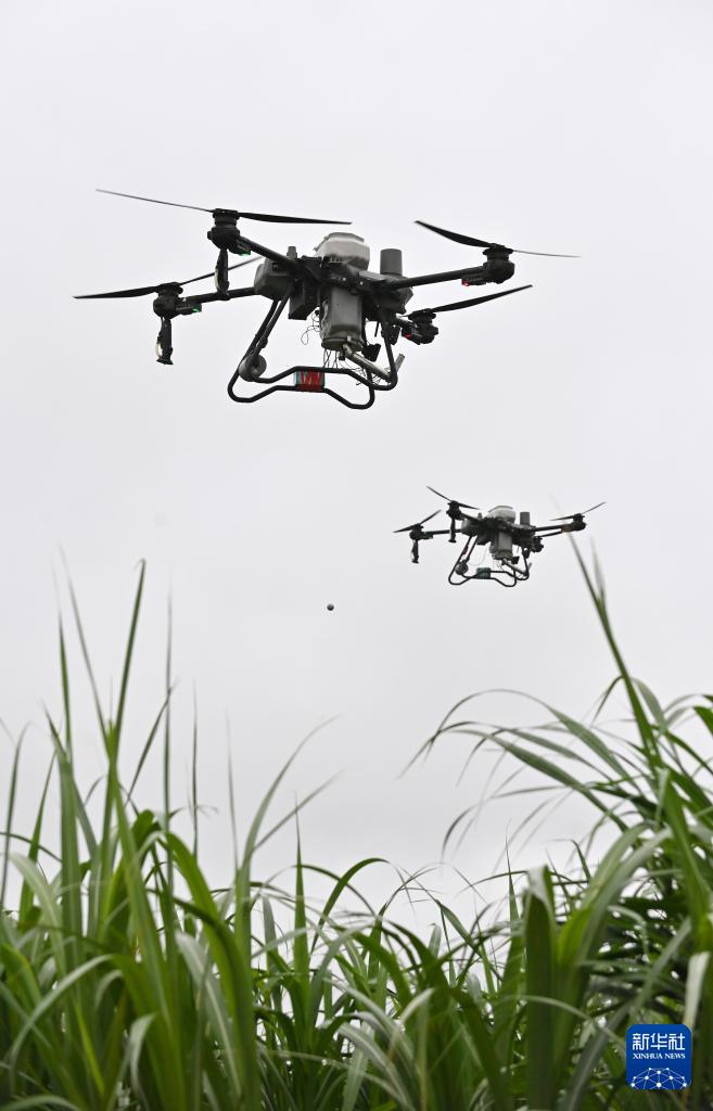 7月23日,在位于广西上思县的昌菱农场蔗区,无人机在飞行中释放螟黄赤眼蜂球。