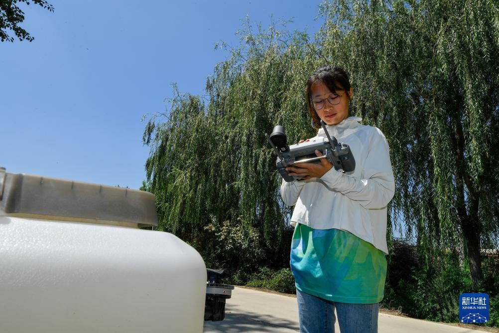 7月21日,在位于吉林省四平市梨树县的“科技小院”试验田,中国农业大学学生黄怡调整植保无人机参数。