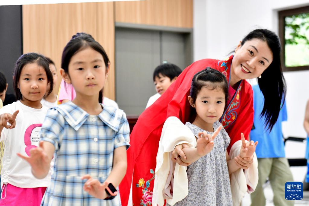 7月23日,在博兴县博昌街道东风社区“滨滨学堂”,博兴县戏剧团的孙娟娟在教孩子们戏剧表演。