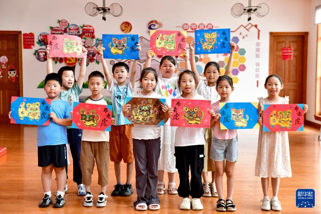 7月23日,在博兴县城东街道御华社区“滨滨学堂”,孩子们展示自己制作的布老虎贴画。