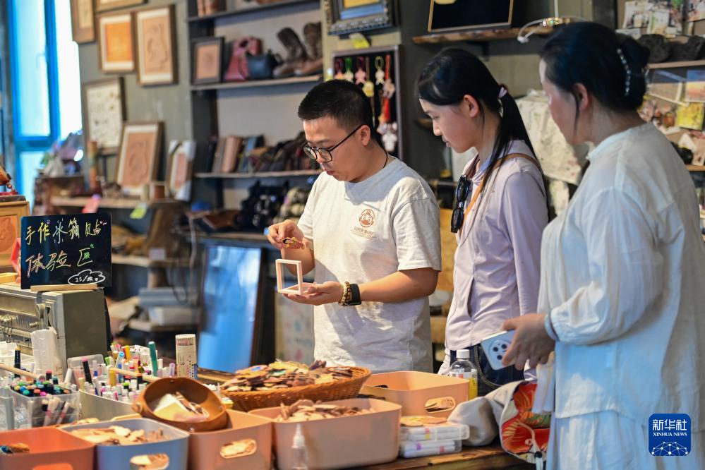 游客在新疆伊犁哈萨克自治州伊宁市伊犁老城喀赞其文化旅游区传统技艺展示区挑选商品(7月23日摄)。