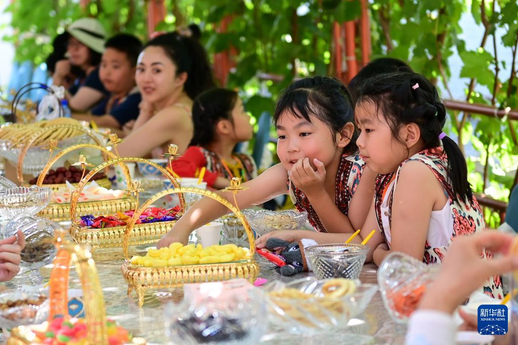 游客在新疆伊犁哈萨克自治州伊宁市伊犁老城喀赞其文化旅游区家访点品尝当地美食(7月23日摄)。