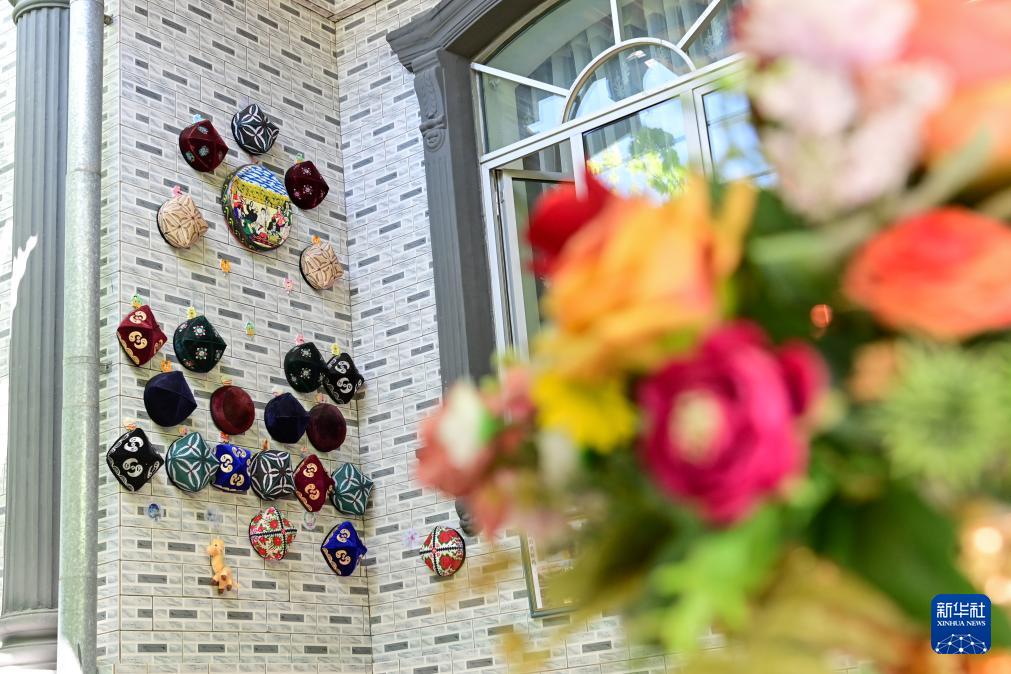 游客在新疆伊犁哈萨克自治州伊宁市伊犁老城喀赞其文化旅游区石榴花展览馆拍照(7月23日摄)。