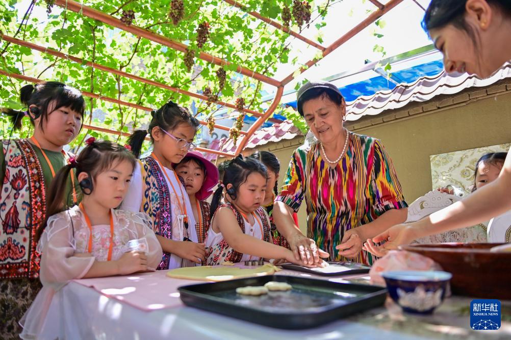 研学游的小朋友在新疆伊犁哈萨克自治州伊宁市伊犁老城喀赞其文化旅游区学做当地特色糕点(7月23日摄)。